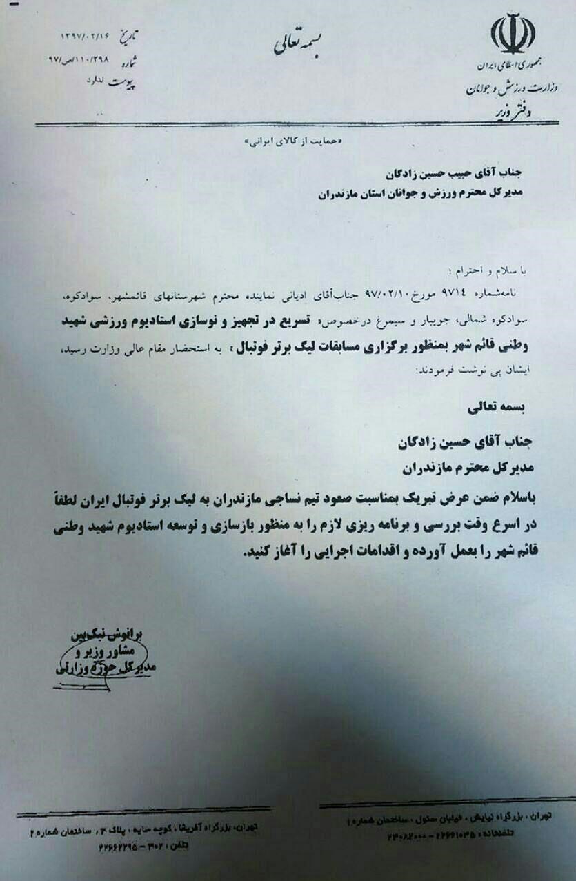وزیر ورزش و جوانان همچنین در این نامه صعود نساجی مازندران به لیگ برتر را تبریک گفت. تصویر نامه وزیر ورزش و جوانان به شرح زیر است: