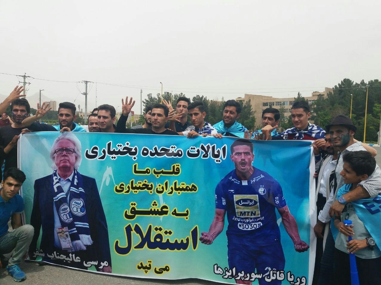 * تعدادی از هواداران بختیاری استقلال بنر بزرگی در دست دارند که روی آن تصاویری از وینفرد شفر و وریا غفوری و جملاتی در حمایت از آنها دیده میشود.