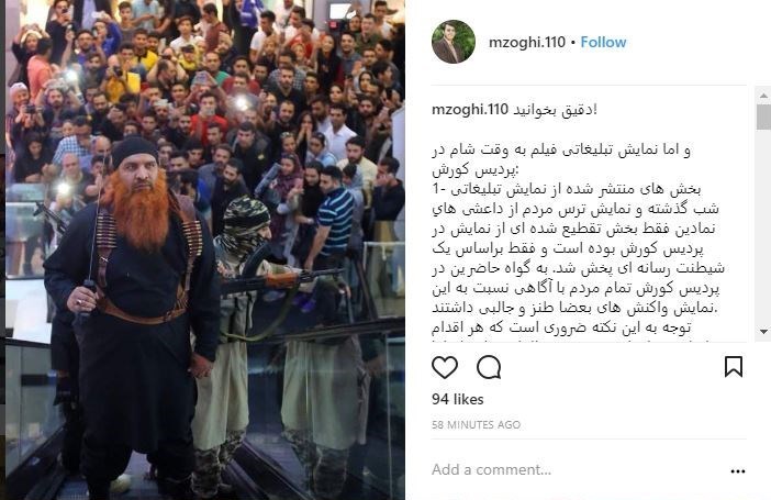 1- بخش های منتشر شده از نمایش تبلیغاتی شب گذشته و نمایش ترس مردم از داعشی هایِ نمادین فقط بخش تقطیع شده ای از نمایش در پردیس کورش بوده است و فقط براساس یک شیطنت رسانه ای پخش شد. به گواه حاضرین در پردیس کورش تمام مردم با آگاهی نسبت به این نمایش واکنش های بعضا طنز و جالبی داشتند.