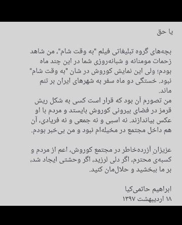 در پیام مذکور آمده است: بچههای گروه تبلیغاتی فیلم «به وقت شام»، من شاهد زحمات مومنانه و شبانهروزی شما در این چند ماه بودم؛ ولی این نمایش کورش در شأن «به وقت شام» نبود. خستگی دو ماه سفر به شهرهای ایران بر تنم ماند. من تصورم آن بود که قرار است کسی به شکل ریش قرمز در فضای بیرونی کورش بایستد و مردم با او عکس بیاندازند. نه اسبی و نه جمعی و نه فریادی، آن هم داخل مجتمع در مخیلهام نبود و من بیخبر بودم. عزیزانِ آزردهخاطر در مجتمع کورش، اعم از مردم و کسبه محترم، اگر دلی لرزید، اگر وحشتی ایجاد شد، بر ما ببخشید و حلالمان کنید.