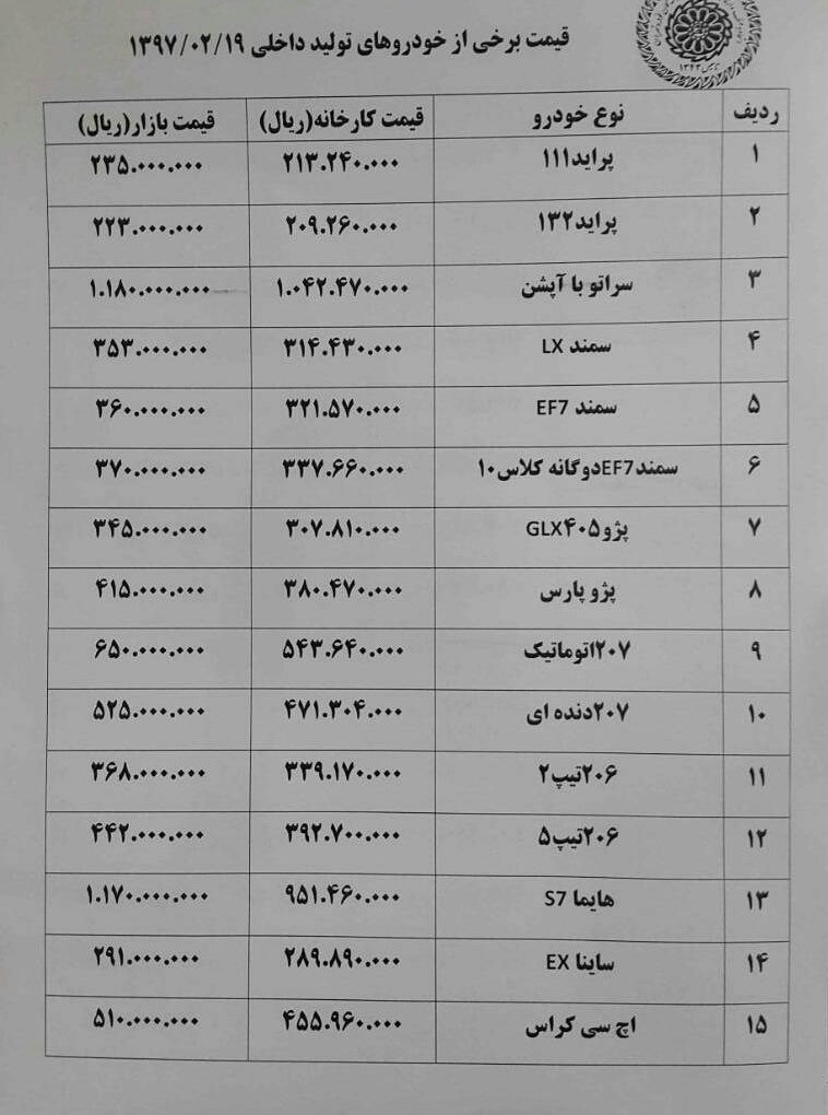 قیمت تعدادی از خودروهای داخلی در بازار امروز به شرح زیر است: