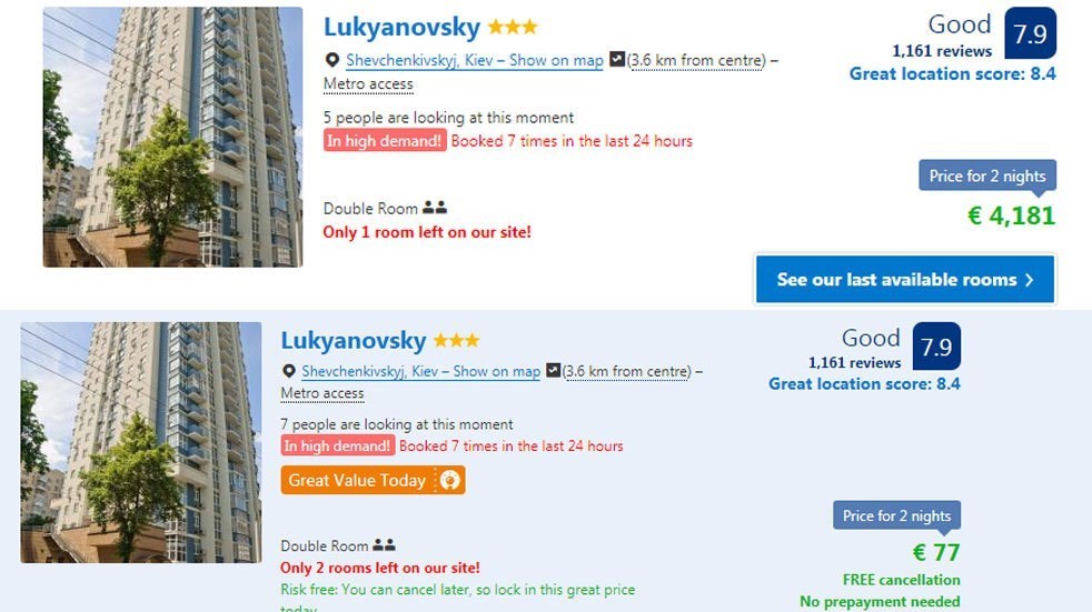 در میان تمام مدارکی که برای سودجویی اوکراینیها منتشر شد، بدون شک بدترین نمونه مربوط به هتلی در فاصله 3.6 کیلیومتری مرکز شهر کیف است که صفحه رزواسیون اینترنتی اتاقهایی مشابه از این هتل را در دو تاریخ متفاوت نشان میدهد. قیمت رزو یک اتاق در این هتل 3 ستاره برخی تصاویر از صفحه رزواسیون اینترنتی هتل در شهر کیف نشان میدهد، که رزو آن برای شب ماقبل فینال لیگ قهرمانان و شب برگزاری بازی به 4 هزار و 181 یورو رسیده در حالی که رزو همان اتاق یک هفته بعد از بازی 77 یورو است.