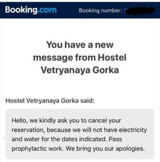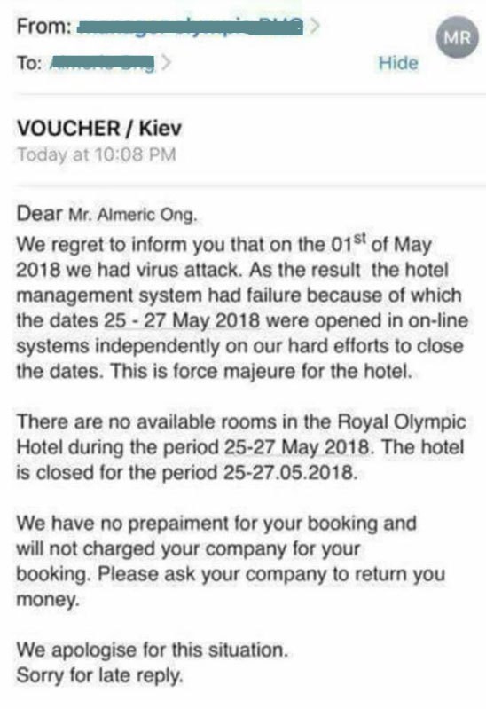 یکی دیگر از مسافران کیف که رزواسیون هتل مورد نظرش در شهر کیف لغو شده، تصویری از ایمیل دریافتی از سوی هتل را در شبکههای اجتماعی قرار داده تا بهانه مضحک این هتل برای رد تقاضای او را فاش کند. در این ایمیل آمده است که به دلیل حمله ویروسی به هتل، رزواسیون تمامی اتاقهای هتل تا تاریخ 27 می غیرممکن است. از آنجایی که شما برای رزرو اتاقتان هیچ پیش پرداختی نداشتهاید، رزواسیون شما لغو میشود اما نیازی به پرداخت غرامت نیست.