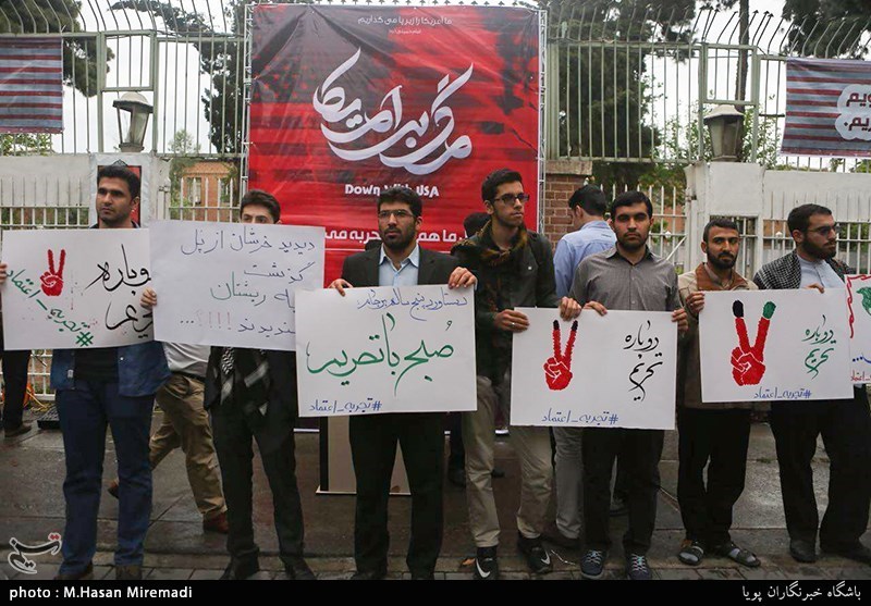 دانشجویان در این تجمع که با حضور پر تعداد رسانههای خارجی برگزار شد با در دست داشتن نوشتههایی چون "برجام امریکایی خسارت محض"، "دوباره تحریم تجربه اعتماد" و سر دادن شعارهایی چون "آمریکا، اروپا ننگ به نیرنگتان"، "مرگ بر آمریکا"، "مرگ بر اسراییل" به رفتار آمریکا در برجام اعتراض کردند.