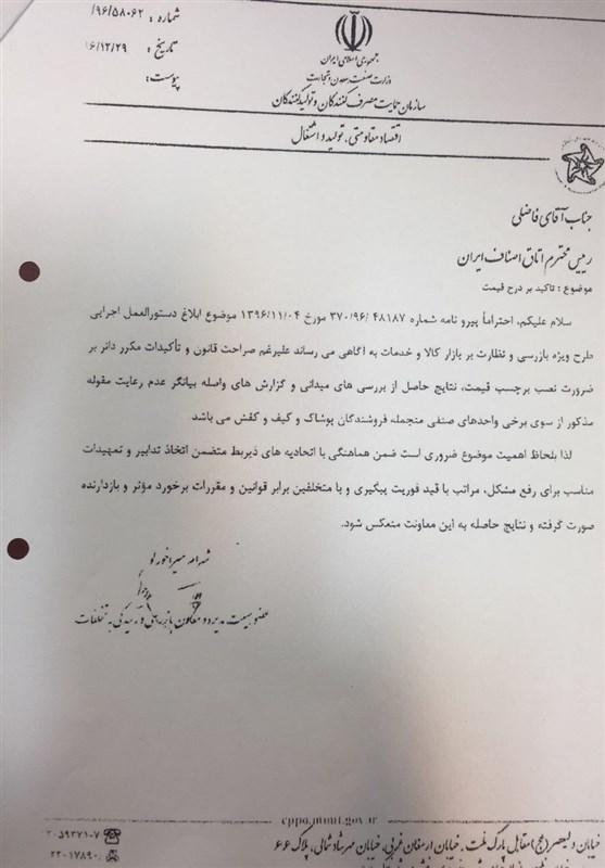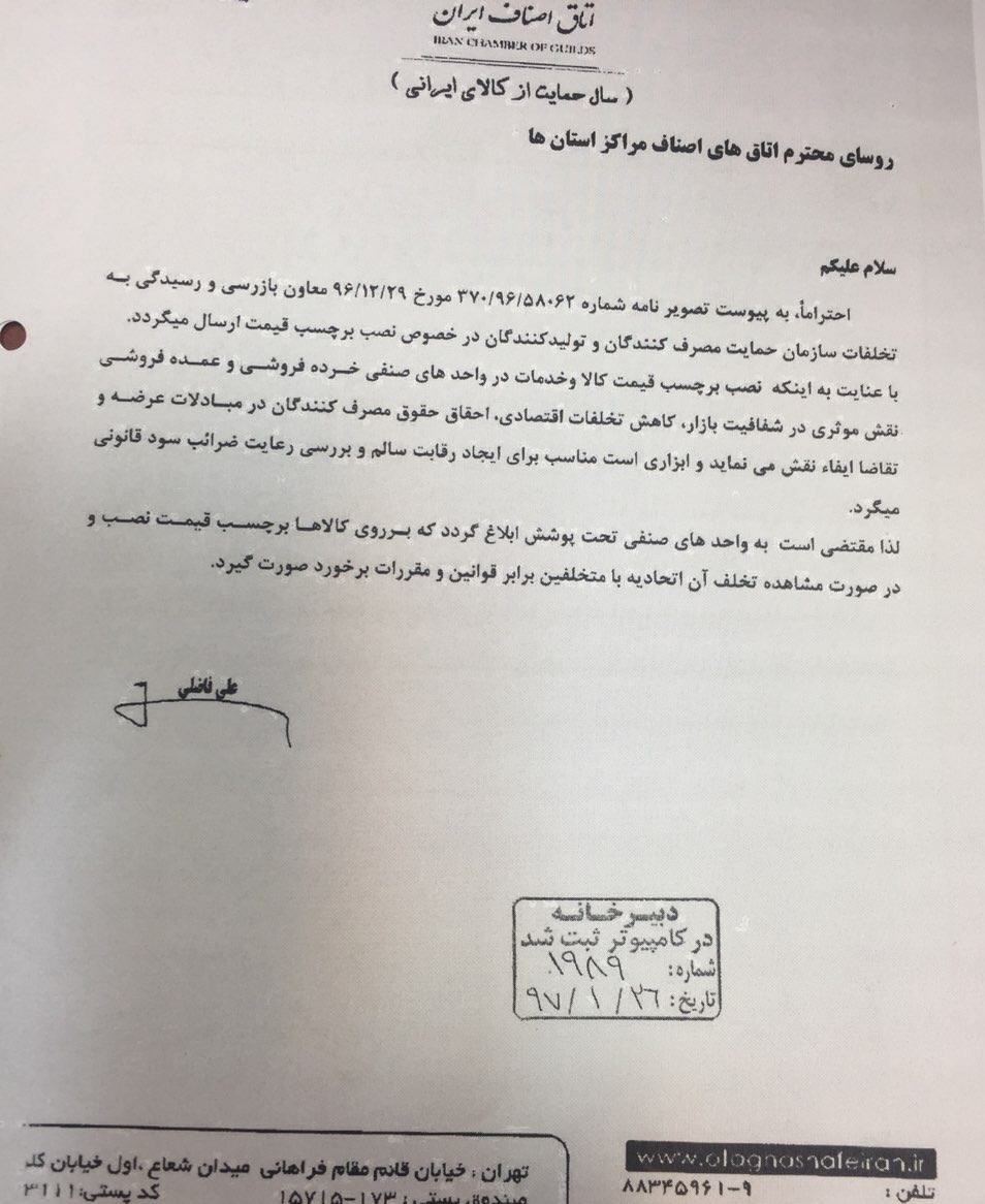 پیرو مکاتبات قبلی در خصوص درج قیمت و رعایت موازین قانونی بدین وسیله تصویر نامه شماره 7/132/1269 مورخ 1397/01/22 اتاق اصناف ایران مبنی بر نصب برچسب قیمت کالا و خدمات در واحدهای صنفی خردهفروشی و عمدهفروشی به پیوست جهت اطلاع و اقدام لازم ایفاد میگردد.