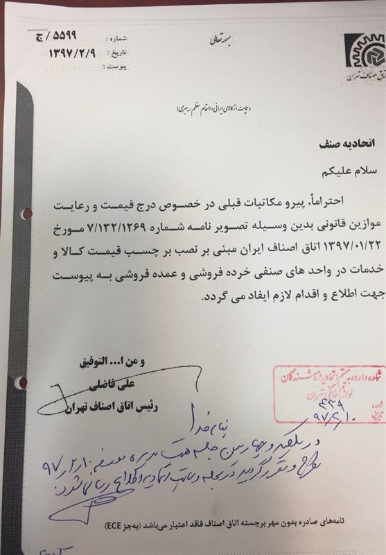 بنابراین گزارش اتحادیه صنف بر اساس این نامه رئیس اتاق اصناف تهران نامه ای به اتحادیه های صنفی به شرح زیر می نویسد: