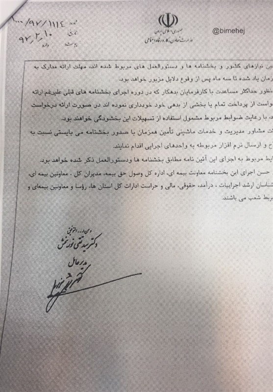 سایر شرایط مربوط به اجرای این آئیننامه مطابق بخشنامه معاونت بیمهای، اداره کل وصول حق بیمه، مدیران کل، معاونین بیمهای،روسا و کارشناسان ارشد اجراییات، درآمد، حقوقی، مالی و حراست ادارات کل استانها، روسا و معاونین بیمهای و مسئولین ذیرب شعب میباشند.