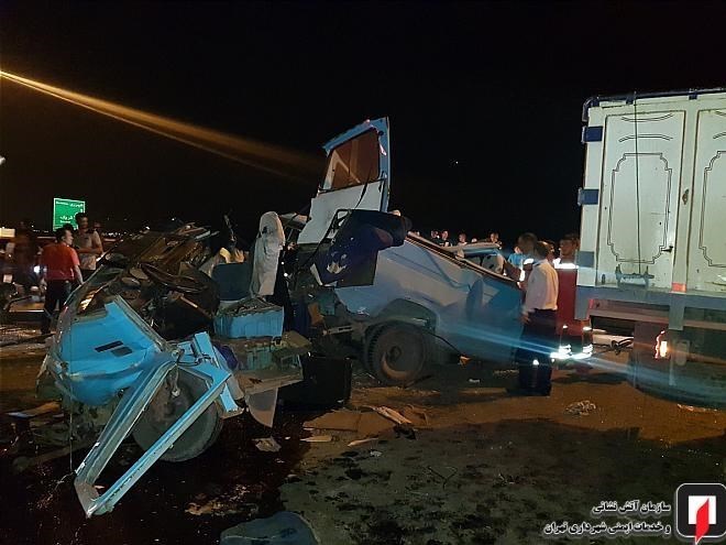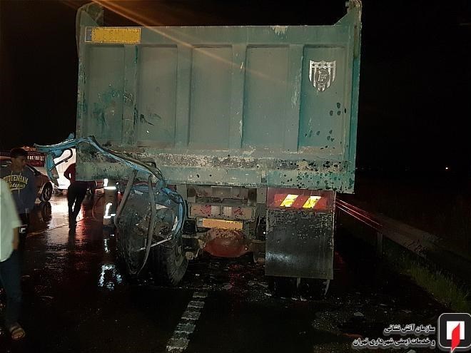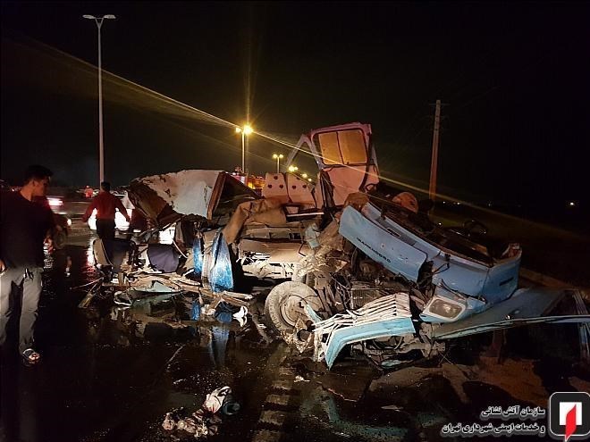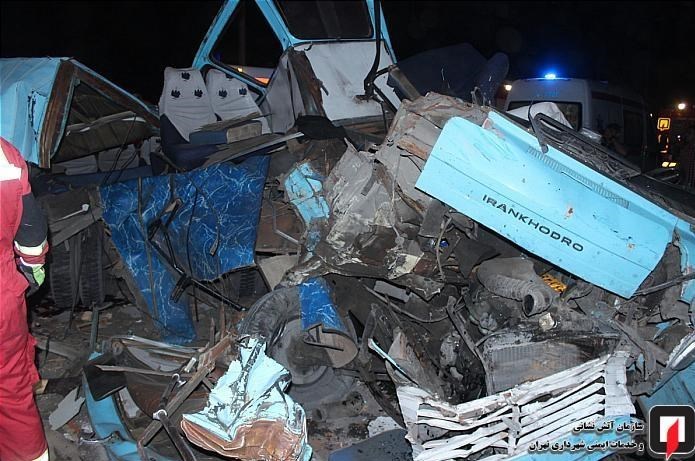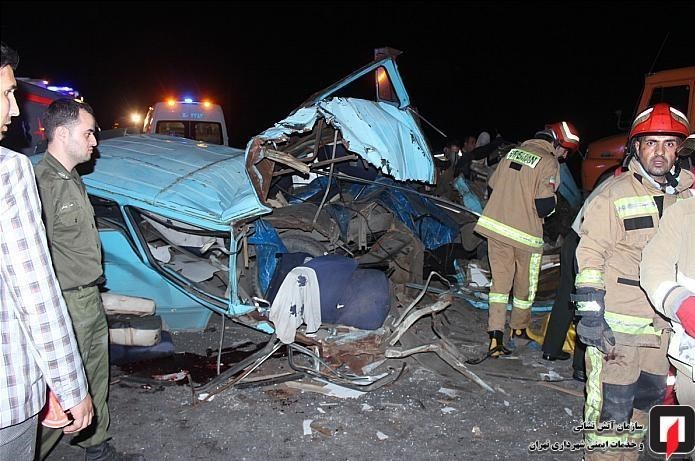 در این حادثه که شب گذشته به وقوع پیوست، یک دستگاه مینیبوس با عقب یک دستگاه کامیون کمپرسی تصادف کرد؛ شدت این تصادف به حدی بود که مینیبوس کاملاً متلاشی شد همچنین در این حادثه دو خودروی دیگر شامل یک دستگاه پراید و یک دستگاه تیبا با مینیبوس و کامیون برخورد کردند.
