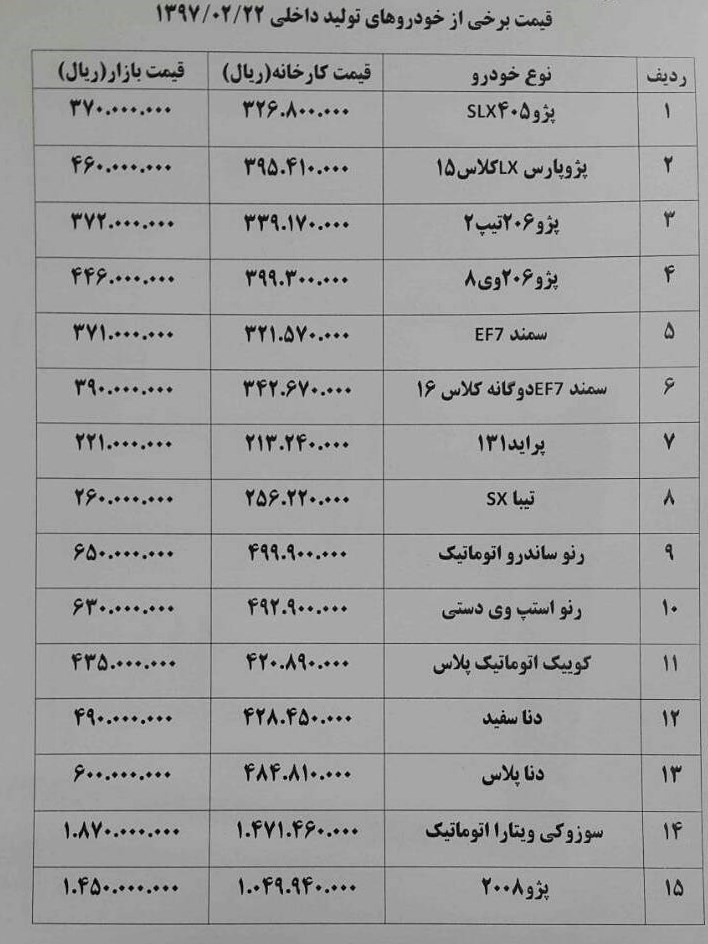 همچنین قیمت خودرو پژو 405 اس ال ایکس با افزایش 2 میلیون تومانی با قیمت 37 میلیون و 500 هزار تومان، پژو 207i اتوماتیک با افزایش 2 میلیون تومانی با قیمت 65 میلیون تومان، تندر پلاس با رشد 2 میلیون و 500 هزار تومانی با قیمت 66 میلیون تومان، مزدا3 با رشد 10 میلیون تومانی با قیمت 164 میلیون تومان، سوزوکی با رشد 7 میلیون تومانی با قیمت 187 میلیون تومان، پژو 2008 با رشد 10 میلیون تومانی با قیمت 145 میلیون تومان به فروش می رسد.