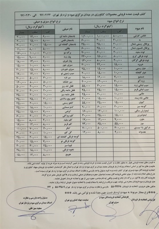 قیمتهای مذکور بر اساس استعلام روزانه از بارفروشان متعدد میدان مرکزی میوه و ترهبار تهران و اعمال نظر کارشناسان اتحادیه بارفروشان جهاد کشاورزی و اتحادیه فروشندگان میوه و سبزی تهران کشف شده و به تایید واحدهای بازرسی و نظارت اصناف میدان مرکزی میوه و ترهبار تهران رسیده است.