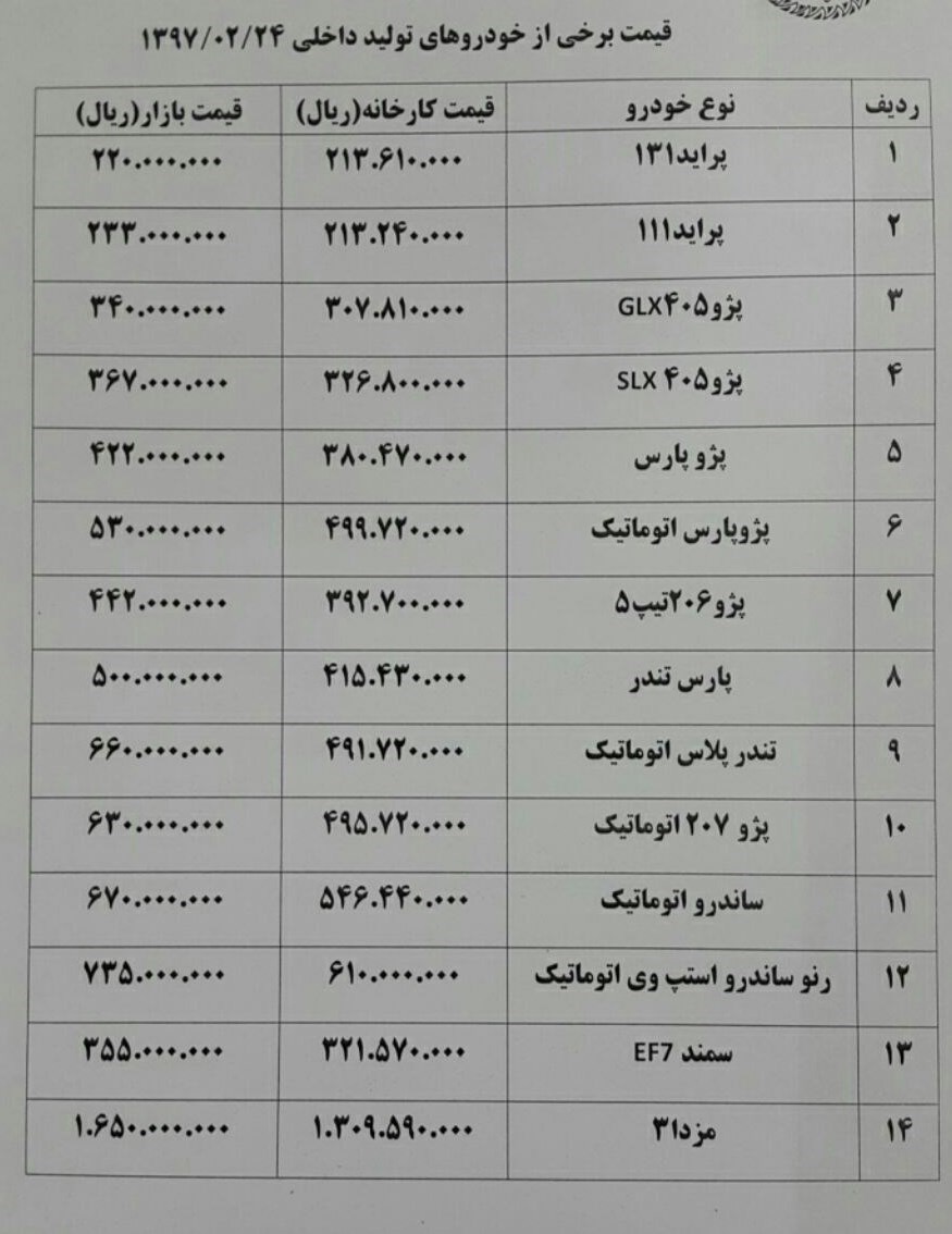 قیمت تعدادی از خودروهای داخلی در بازار امروز بهشرح زیر است: