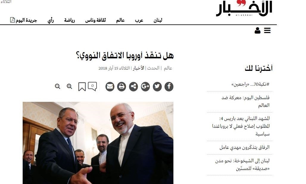 در همین ارتباط روزنامه الاخبار در مطلبی با عنوان "آیا اروپا توافق هستهای را نجات میدهد؟" نوشت: نگاهها به بروکسل دوخته شده است که وزیر خارجه ایران در چارچوب سفر به چند کشور عازم آنجا شده است تا در مورد سرنوشت توافق هستهای پس از خروج آمریکا از آن باخبر شود.