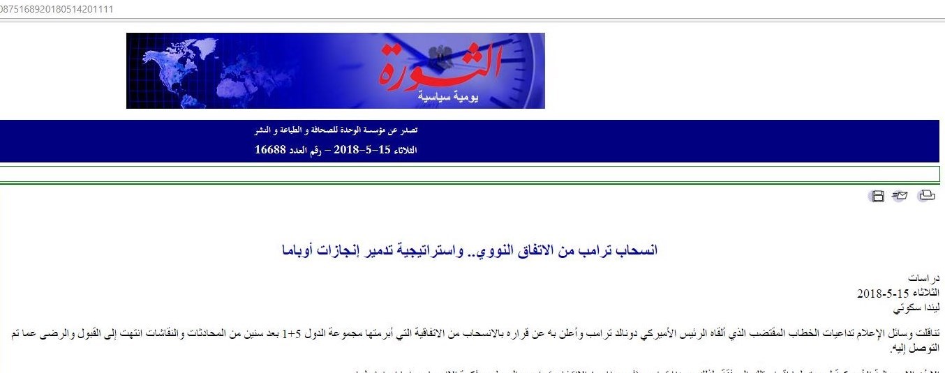 روزنامه الثورة سوریه مطلبی را با این عنوان منتشر کرد: "خروج ترامپ از توافق هستهای.. راهبرد تخریب دستاوردهای اوباما".