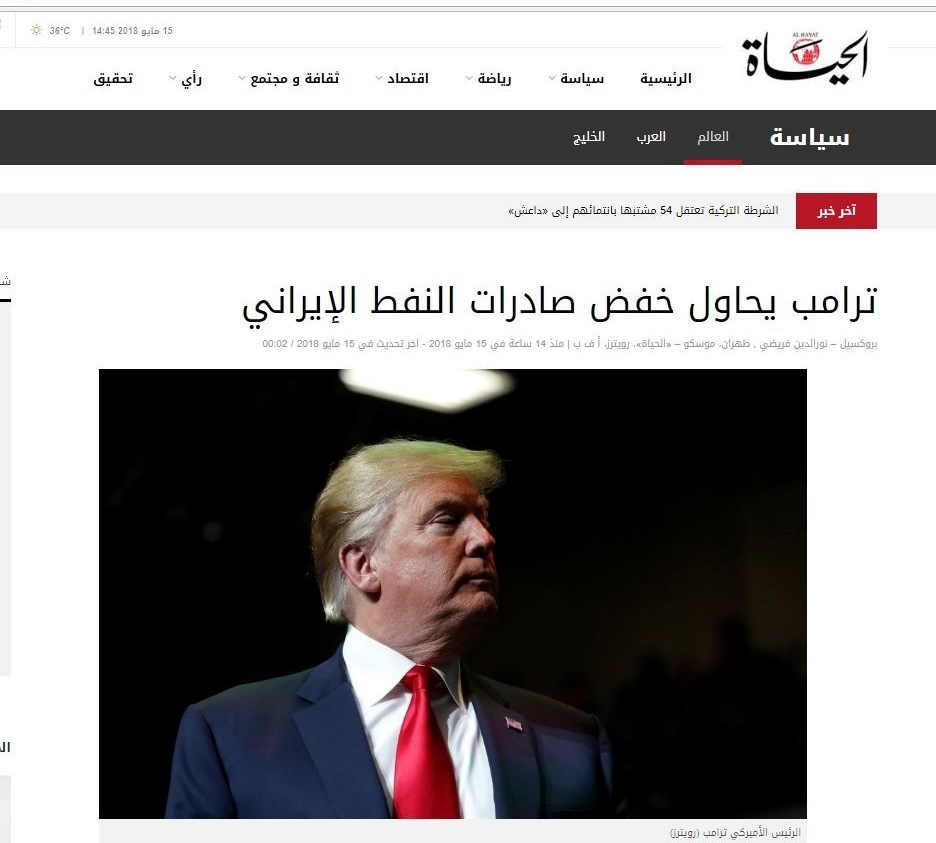 روزنامه الحیات نیز مطلبی با این عنوان منتشر کرد: ترامپ تلاش دارد صادرات نفت ایران را کاهش دهد.