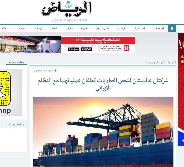 روزنامه الریاض از دیگر روزنامههای سعودی این عنوان را منتشر کرد: "دو شرکت بزرگ بین المللی بارگیری کانتینرها تعامل با نظام ایران را تعلیق میکنند".