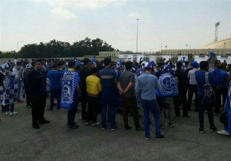 * هواداران استقلال پرچمهای بزرگی در دست دارند تا آنها را با خود به داخل ورزشگاه ببرند.
