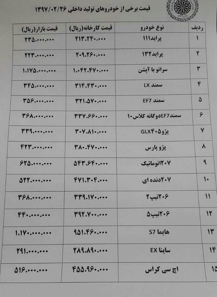 قیمت انواع خودرو در بازار داخلی به شرح زیر است: