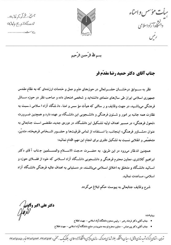 «نظر به سوابق درخشان حضرتعالی در حوزههای علم و عمل و خدمات ارزندهای که به نظام مقدس جمهوری اسلامی ایران طی سالهای متمادی داشتهاید و شخصی امتحان داده و صاحبنظر در حوزه مسائل فرهنگی میباشید، در جهت وظایف و رسالتی که هیأت موسس و امنا دانشگاه آزاد اسلامی نسبت به نظارت همه جانبه بر امور و شئون فرهنگی و دانشجویی این دانشگاه برعهده دارد و همچنین ضرورت «تحول فرهنگی» در مسیر اهداف اولیه تشکیل این دانشگاه، در دورهی جدید، مقتضی است جنابعالی به عنوان «مشاور فرهنگی» اینجانب، با استفاده از تمامی ظرفیتها و حضور اشخاص فرهیخته، متدین، متخصص و انقلابی نسبت به تشکیل دفتری برای انجام این مهم، اقدام نمائید.