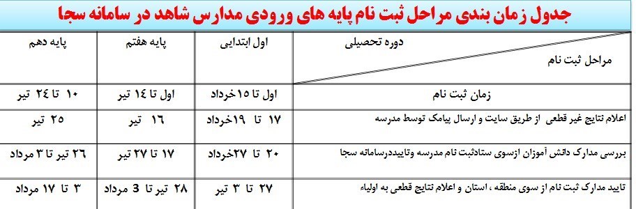 جدول زمانبندی مراحل ثبتنام پایههای ورودی مدارس شاهد در سامانه سجا