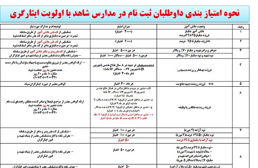 نحوه امتیازبندی داوطلبان ثبتنام در مدارس شاهد با اولویت ایثارگری