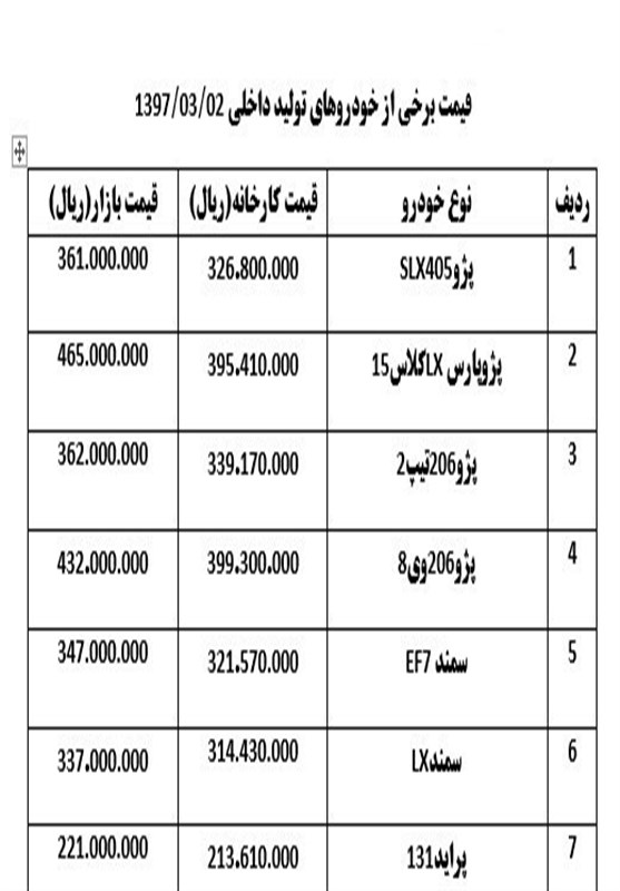 قیمت تعدادی از خودرو های داخلی در امروز به شرح زیر است: