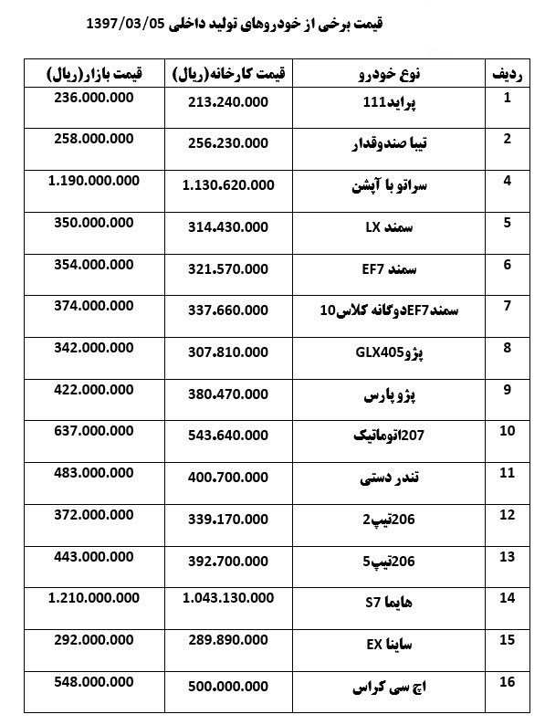 قیمت تعدادی از خودروهای داخلی در بازار امروز به شرح زیر است: