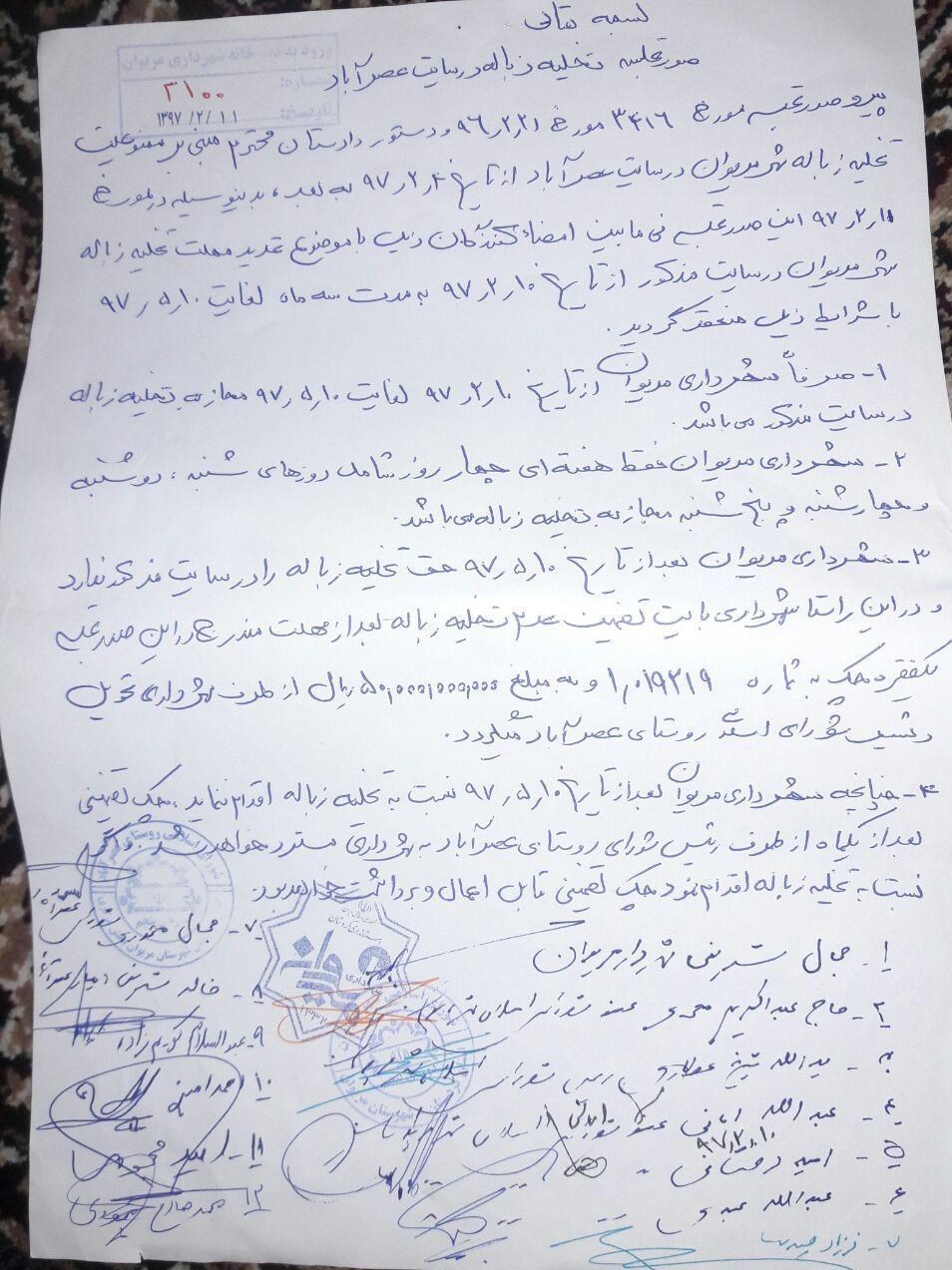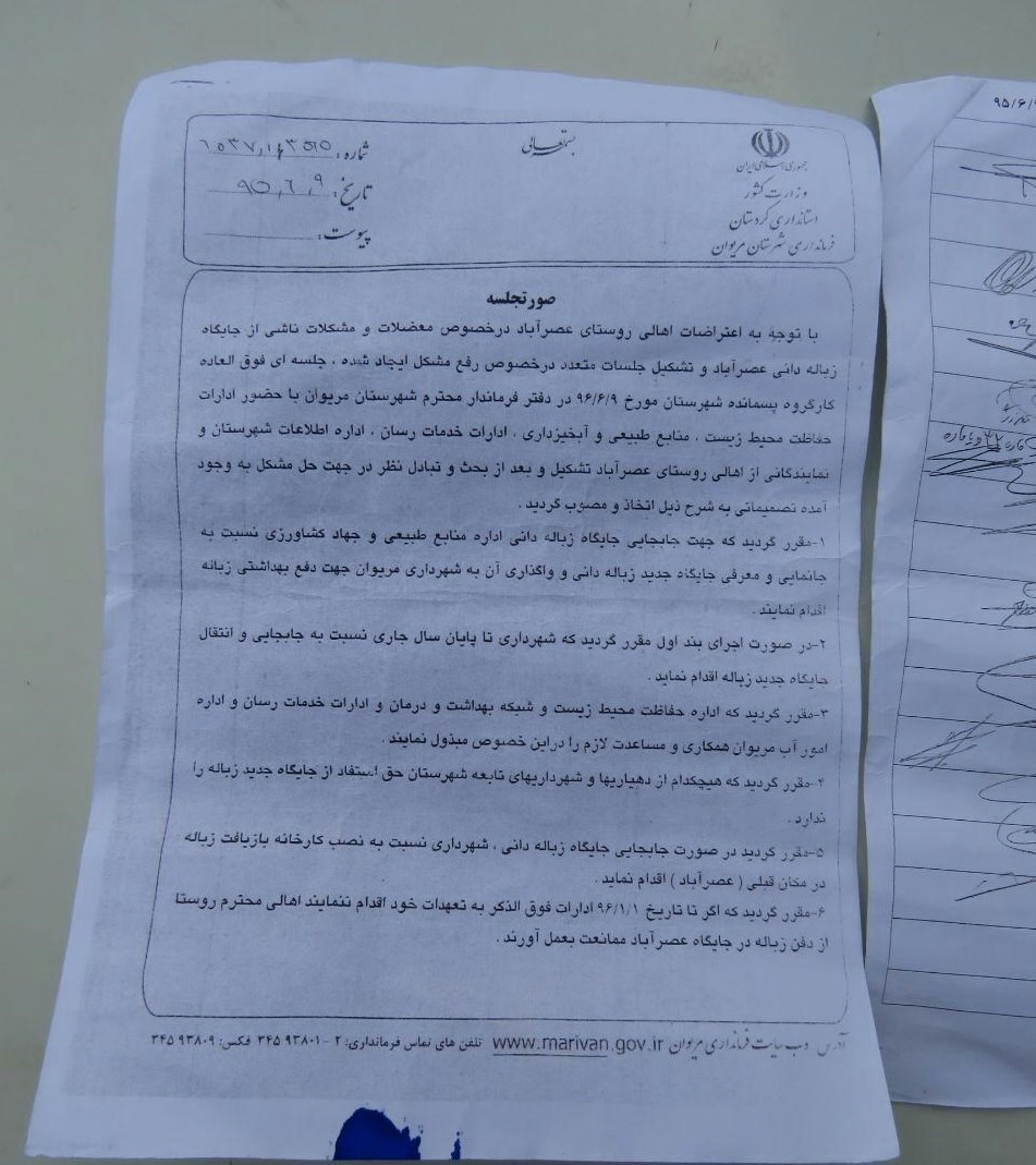باید یادآور شد، در روز نهم شهریورماه سال 95 به دنبال اعتراضات مردم روستای "عصرآباد" مریوان نسبت به انتخاب محل دپوی زباله شهرستان در این روستا، کارگروه پسماند با حضور فرماندار و شهردار سابق مریوان، مسئولان ادارات خدماترسان حفاظت محیط زیست، منابعطبیعی و آبخیزداری، و نماینده روستاها در سالن فرمانداری برگزار و پس از بحث و تبادل نظر به اینگونه تصمیمگیری، صورتجلسه و امضاء انجام شد که چنانچه ادارت مذکور، تا تاریخ 96/1/1 نسبت به ساماندهی پسماند شهری اقدام نکنند، مردم روستای "عصرآباد" میتوانند از دفن زباله در این محل جلوگیری کنند.
