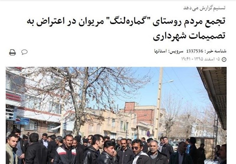 همچنین مردم روستای "گمارهلنگ" از توابع بخش سرشیو مریوان نیز در اعتراض به تصمیمات شهرداری برای محل دپو زباله شهرستان نزدیک این روستا در پنجم اسفندماه سال 95 مقابل فرمانداری مریوان تجمع و نارضایتی خود را از وضعیت موجود اعلام کردند.
