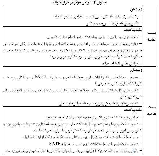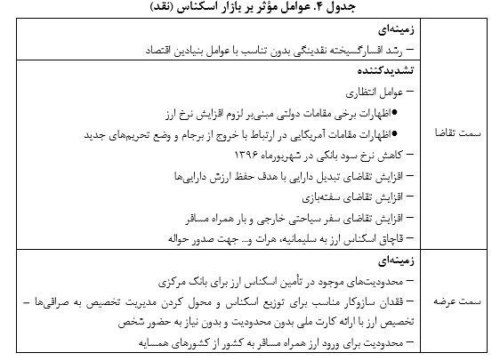 این گزارش در تحلیل علل افزایش نرخ ارز، دو عامل اصلی زمینهای و تشدید کننده را برمیشمارد که در بیان این دو علت عنوان شده است که رشد افسارگسیخته نقدینگی، محدودیتهای بانکهای ایرانی در ارتباط با بانکهای بینالمللی و بهتبع نقلوانتقال وجوه و جایگزین شدن صرافیها، وابستگی مسیرهای انتقال وجوه ارزی کشور به برخی نقاط خاص مانند دوبی در امارات متحده عربی، وابستگی به ارزهای واسط مانند دلار و یورو، وابستگی به پیامرسان متمرکز سوئیفت، واردات مدیریتنشده (قاچاق) و افزایش شدید خروج سرمایه بهواسطه نااطمینانی در فضای اقتصادی کشور و اظهارنظرهای مقامات آمریکایی مبنی بر خروج از برجام و نیز ایجاد محدودیتهای جدید در مسیرهای نقلوانتقال ارزی کشور در دوبی، ترکیه و چین که بهدلایل مختلف اعم از مالیات قانون مالیات بر ارزش افزوده در دوبی، تشدید نظارتها و ... به محدود شدن مسیرهای تنفس ارزی کشور، منجر شده است و انتقالات ارزی کشور را دشوارتر، پرریسکتر و پرهزینهتر کرده است و لذا مدیریت بازار ارز را با مشکل مواجه کرده است.