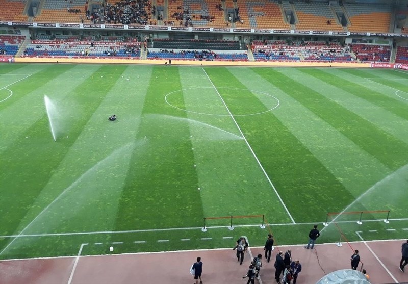 * پیش از آغاز بازی زمین چمن آب پاشی شد.