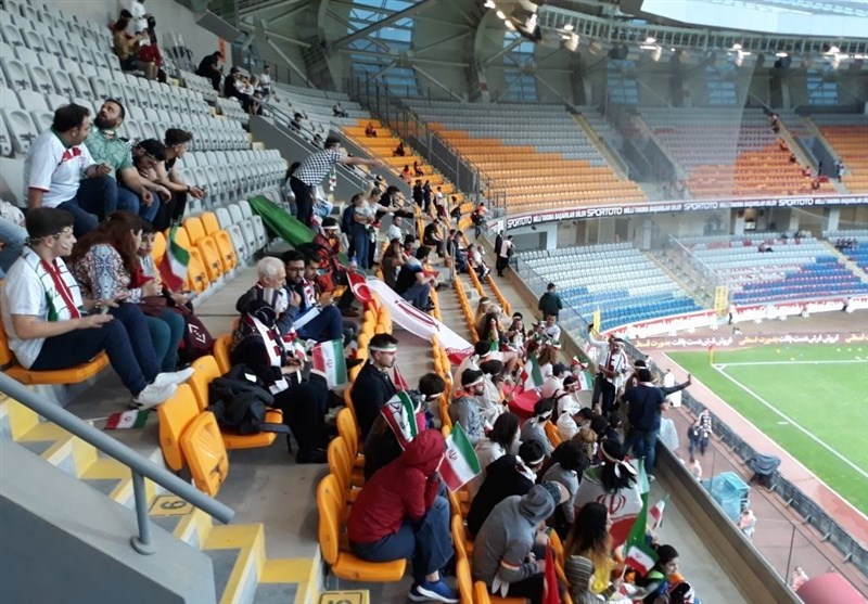 * این هواداران با شعار «ایران، ایران» خود را آماده آغاز مسابقه میکنند.