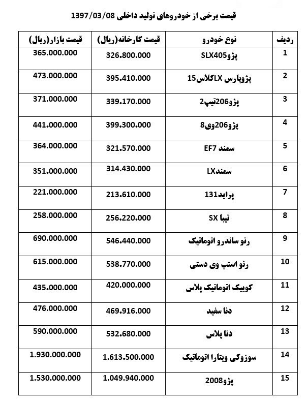 قیمت خودرو در بازار امروز به شرح زیر است: