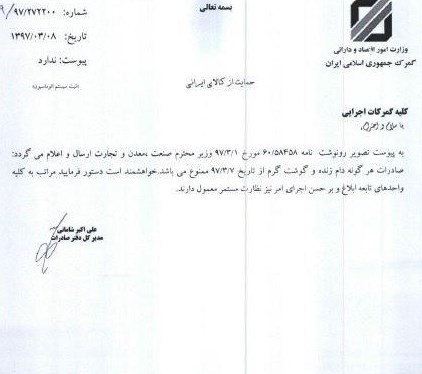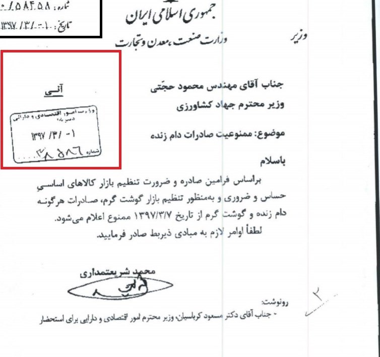 گفتنی است، حدود یک هفته قبل از این ابلاغیه، وزیر صنعت در نامهای به وزیر جهاد کشاورزی با رونوشت به وزیر اقتصاد ممنوعیت صادرات دام زنده و گوشت قرمز را از تاریخ 7 خرداد ماه اعلام کرده بود.