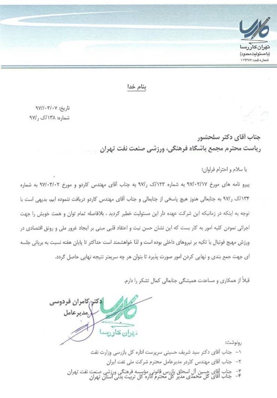 به گزارش تسنیم, در تصویر زیر نامه آخرین مالک باشگاه نفت تهران ( شرکت تهران کار رسا) که برای پیگیری وضعیت این باشگاه به مجمع باشگاه نفت ارسال شده را مشاهده میکنید:
