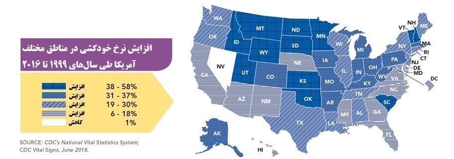 طبق گزارشی که این مرکز تخصصی وزارت بهداشت آمریکا منتشر کرده است، در 18 سال گذشته، نیمی از ایالت‌های آمریکا دست‌کم شاهد افزایشی 30درصدی در نرخ مرگ‌ومیر ناشی از خودکشی بوده‌اند.