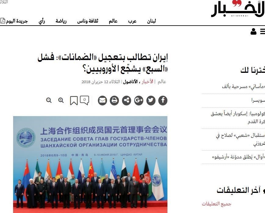 روزنامه الاخبار در مطلبی با عنوان " ایران خواستار سرعت در تضمین ها است": شکست نشست هفت اروپایی ها را تشویق می کند؟ " نوشت: هنوز سرنوشت توافق هسته ای درگروی ابتکار عمل اروپا و گام هایی است که اتحادیه اروپا اتخاذ خواهد کرد که البته به گفته تهران هنوز این تضمین ها و نیز تاثیر این اقدامات اروپا در مقابل تحریم های آمریکا روشن نشده است.