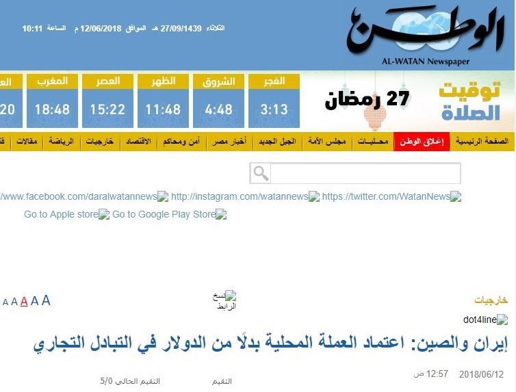روزنامه الوطن کویت در مطلبی با عنوان " ایران و چین به جای دلار از ارز ملی در تبادل تجاری استفاده می کنند" نوشت: چین و ایران در مورد استفاده از پول های داخلی و ملی دو کشور به جای دلار در تبادل تجاری مشترک به توافق رسیدند.