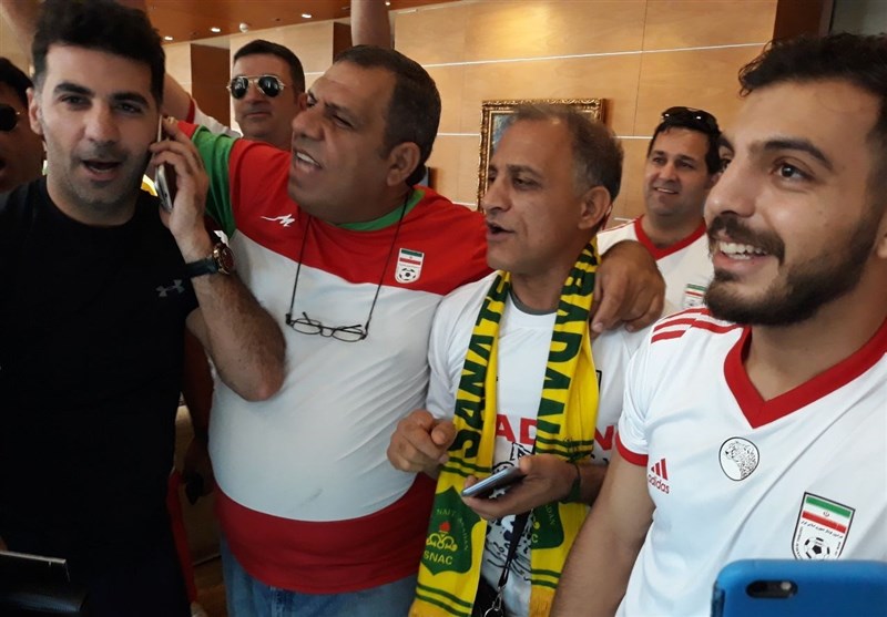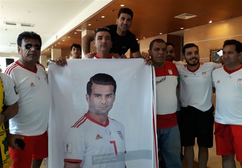 * هواداران ایرانی هم در لابی هتل تیم ملی حاضر شدند و با در دست داشتن بنر مسعود شجاعی به تشویق تیم ملی پرداختند.