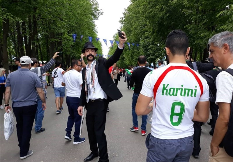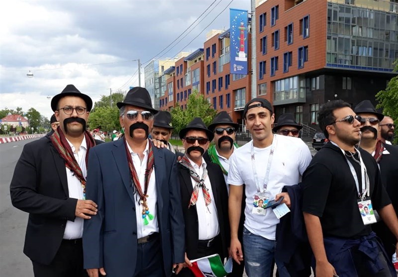 * تعدادی از هواداران ایرانی با کلاه شاپو به سر و سبیلهای مصنوعی در مسیر ورزشگاه در حرکت بودند. چهرههای کاملاً متفاوت آنها حسابی جلب توجه میکرد.