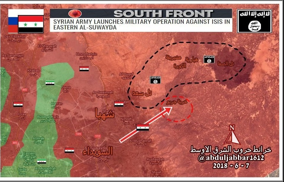 در حالی که ارتش سوریه بهصورت رسمی به گروههای تروریستی مستقر در جنوب این کشور پیام داده که حداکثر تا 15 ژوئن برای ترک منطقه و تسلیم یا مهاجرت به شمال فرصت دارند، ارتش سوریه در شرق استان سویدا نیروهای خود را تجمیع میکند.