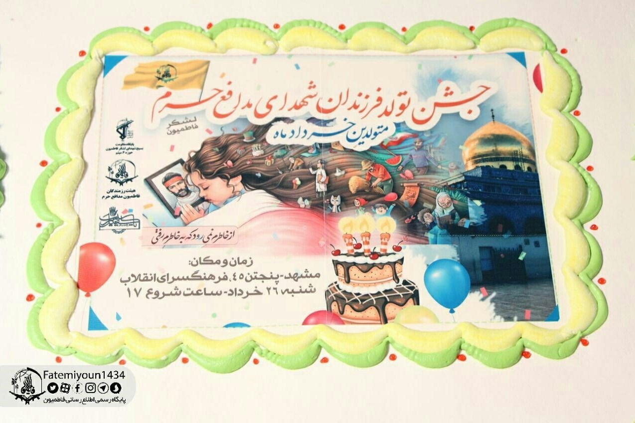 جشن تولد فرزندان شهدای مدافع حرم فاطمیون متولدین خرداد ماه، همزمان با ایام عید سعید فطر برگزار شد. مراسم جشن تولد فرزندان شهدای فاطمیون، به همت پایگاه بسیج شهدای فاطمیون و هیئت رزمندگان مدافع حرم فاطمیون، به صورت ماهانه در مشهد مقدس برگزار میشود.