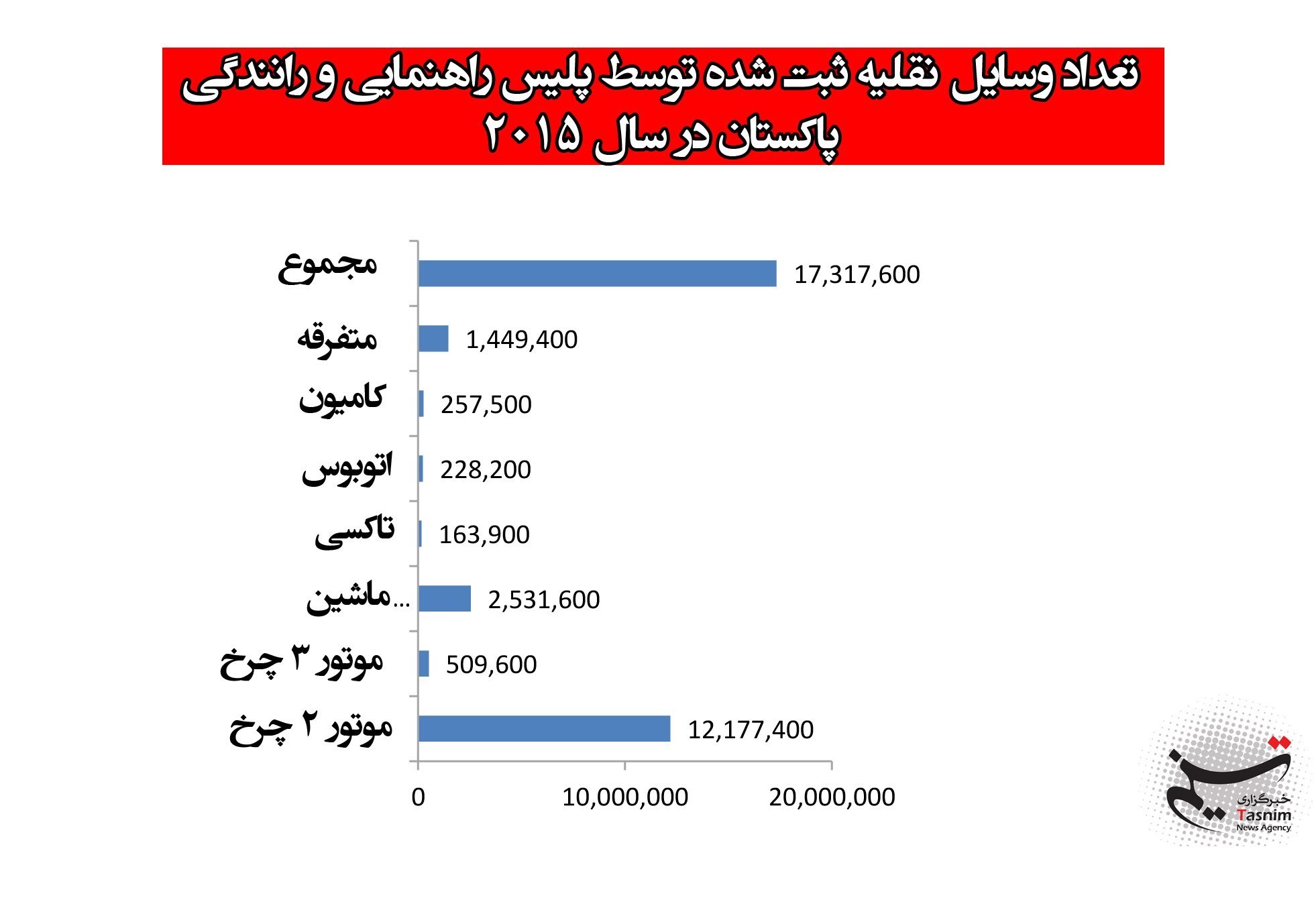 مطالعه مرکز گالوپ پاکستان نشان می دهد که از مجموع17میلیون 449صدهزار و 500 وسیله نقلیه ثبت شده تا سال 2015 نزدیک به 13 میلیون وسیله به موتورسیکلت (2 و 3 چرخ) اختصاص دارد؛ بنابراین تنها نزدیک به 5 میلیون وسیله شامل سایر وسایل موتوری عمومی و خصوصی میشود.