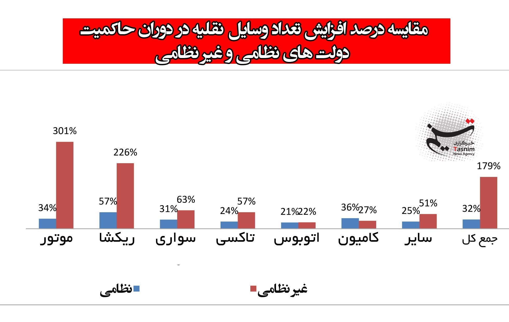این عدد در مقایسه با تعداد 20 میلیونی وسایل نقلیه موتوری به جز موتورسیکلت در ایران تفاوت آشکاری میان دو کشور در شاخص یاد شده را نشان می دهد.