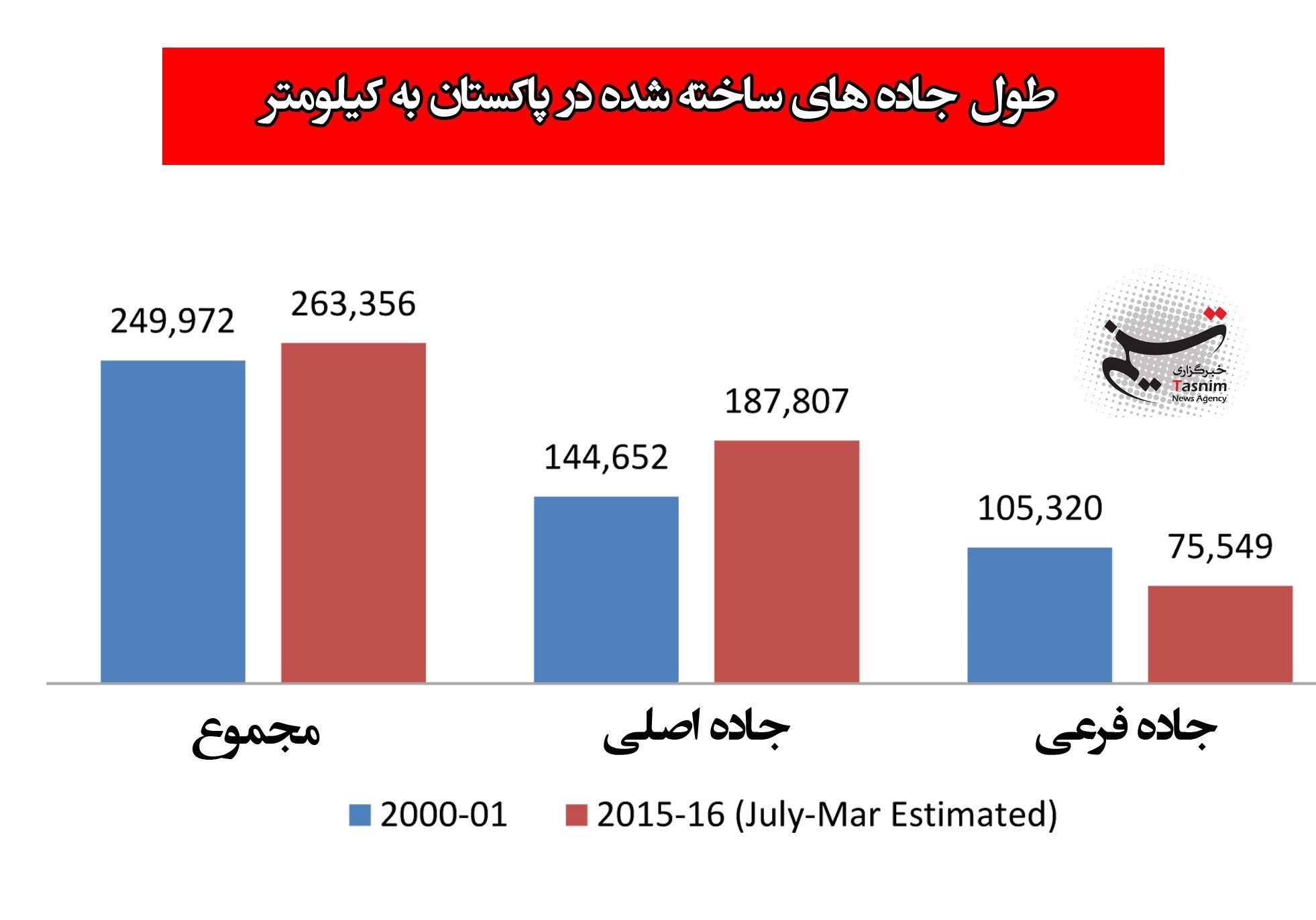 شاخص بعدی زیرساختهای حمل و نقل متعلق به جادهها است که بر اساس مرکز گالوپ پاکستان در سال 2015 دارای 263356 کیلومتر راه بوده است که از این مقدار 187807 کیلومتر متعلق به جادههای اصلی و 75549 کیلومتر اختصاص به جادههای فرعی است. نکته قابل توجه این است که در فاصله سالهای 2000 تا 2015 تنها 5 درصد به طول جادههای پاکستان افزوده شده است با این تفصیل که در 16 سال یادشده 30درصد به راههای اصلی افزوده شده و 28 درصد از راههای فرعی از بین رفتهاند.