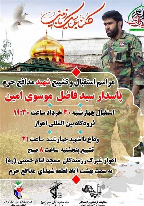 به گزارش خبرگزاری تسنیم در اهواز، مراسم استقبال و تشییع پیکر مطهر شهید مدافع حرم پاسدار سیدفاضل موسویامین باحضور مردم ولایتمدار خوزستان در اهواز برگزار میشود.
