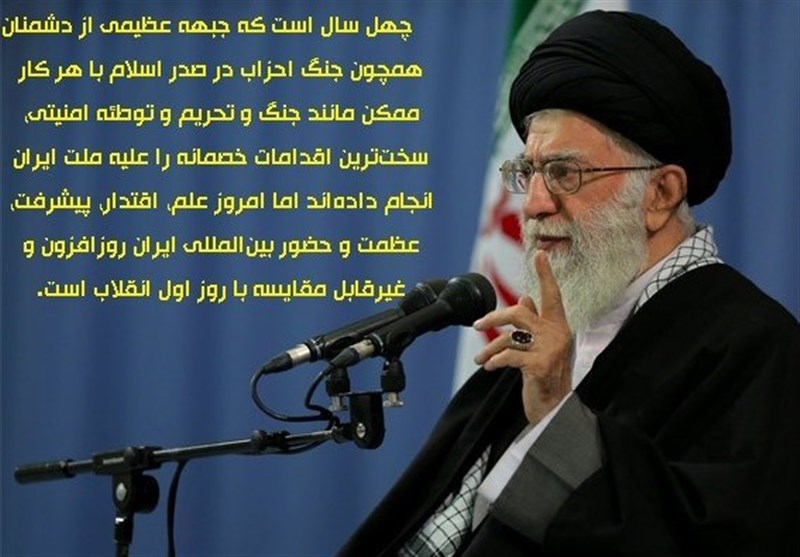 به گزارش خبرنگار فرهنگی باشگاه خبرنگاران پویا رهبر معظم انقلاب در بخشی از فرمایشات خویش در دیدار رئیس و نمایندگان و جمعی از کارکنان مجلس شورای اسلامی با اشاره به دشمنی همهجانبه با مردم ایران در چهل سال گذشته افزودند: «چهل سال است که جبهه عظیمی از دشمنان همچون جنگ احزاب در صدر اسلام با هر کار ممکن مانند جنگ و تحریم و توطئه امنیتی، سختترین اقدامات خصمانه را علیه ملت ایران انجام دادهاند اما امروز علم، اقتدار، پیشرفت، عظمت و حضور بینالمللی ایران روزافزون و غیرقابل مقایسه با روز اول انقلاب است.»