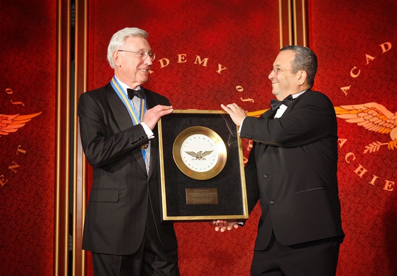 برنارد مارکوس (سمت چپ) در حال دریافت جایزه «بشقاب طلائی» از «ایهود باراک» (سمت راست)، نخستوزیر سابق رژیم صهیونیستی