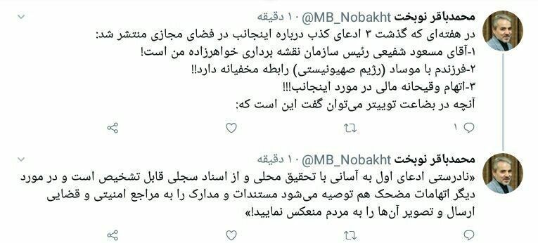 به گزارش حوزه دولت خبرگزاری تسنیم، محمد باقر نوبخت سخنگوی دولت و رئیس سازمان برنامه و بودجه در پیامی توییتری نسبت به حواشی مطرح‌شده پیرامون وی واکنش نشان داد.