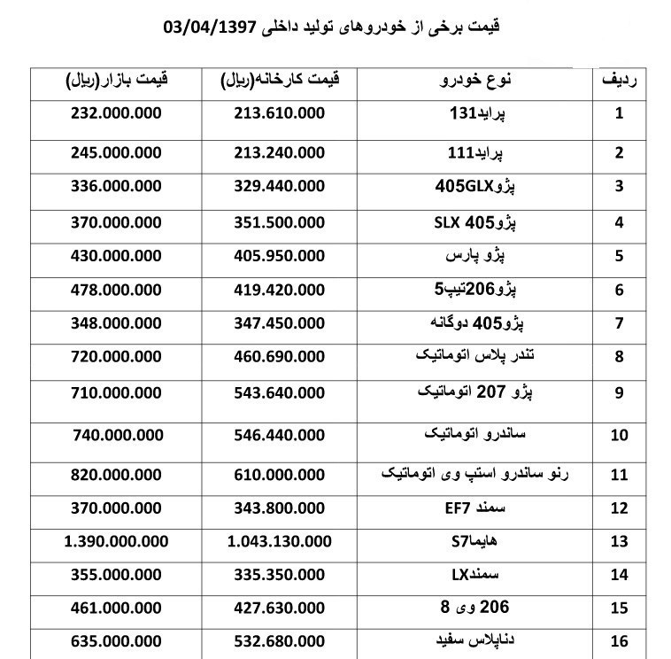 قیمت خودرو در بازار امروز بهشرح زیر است: