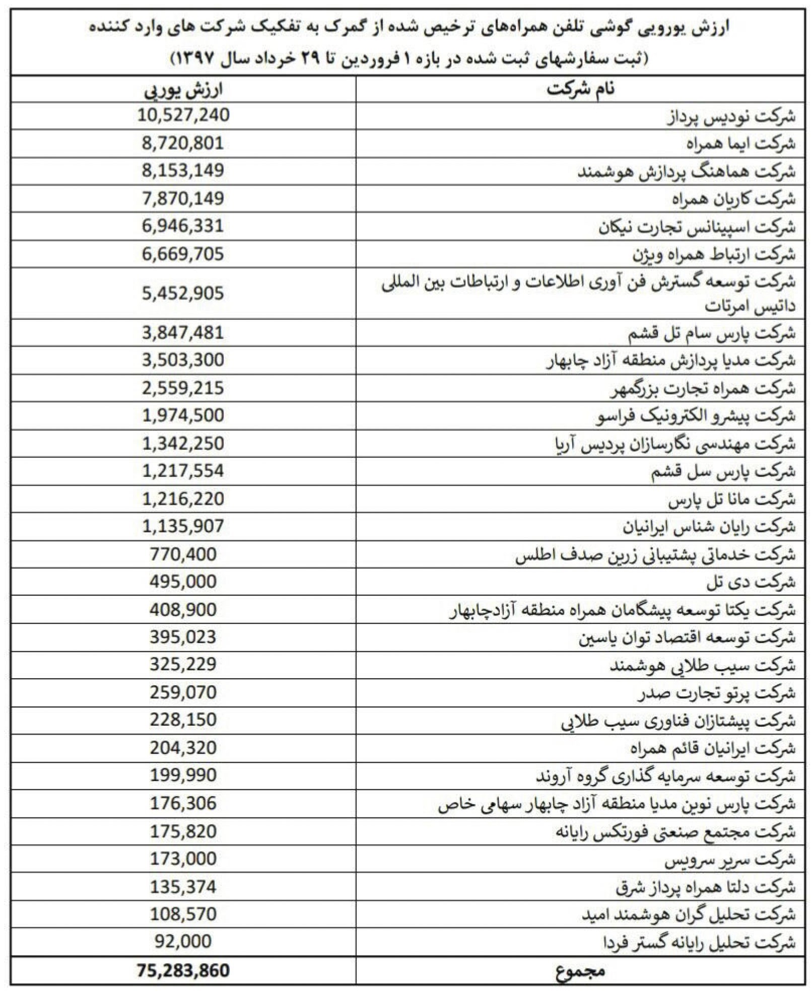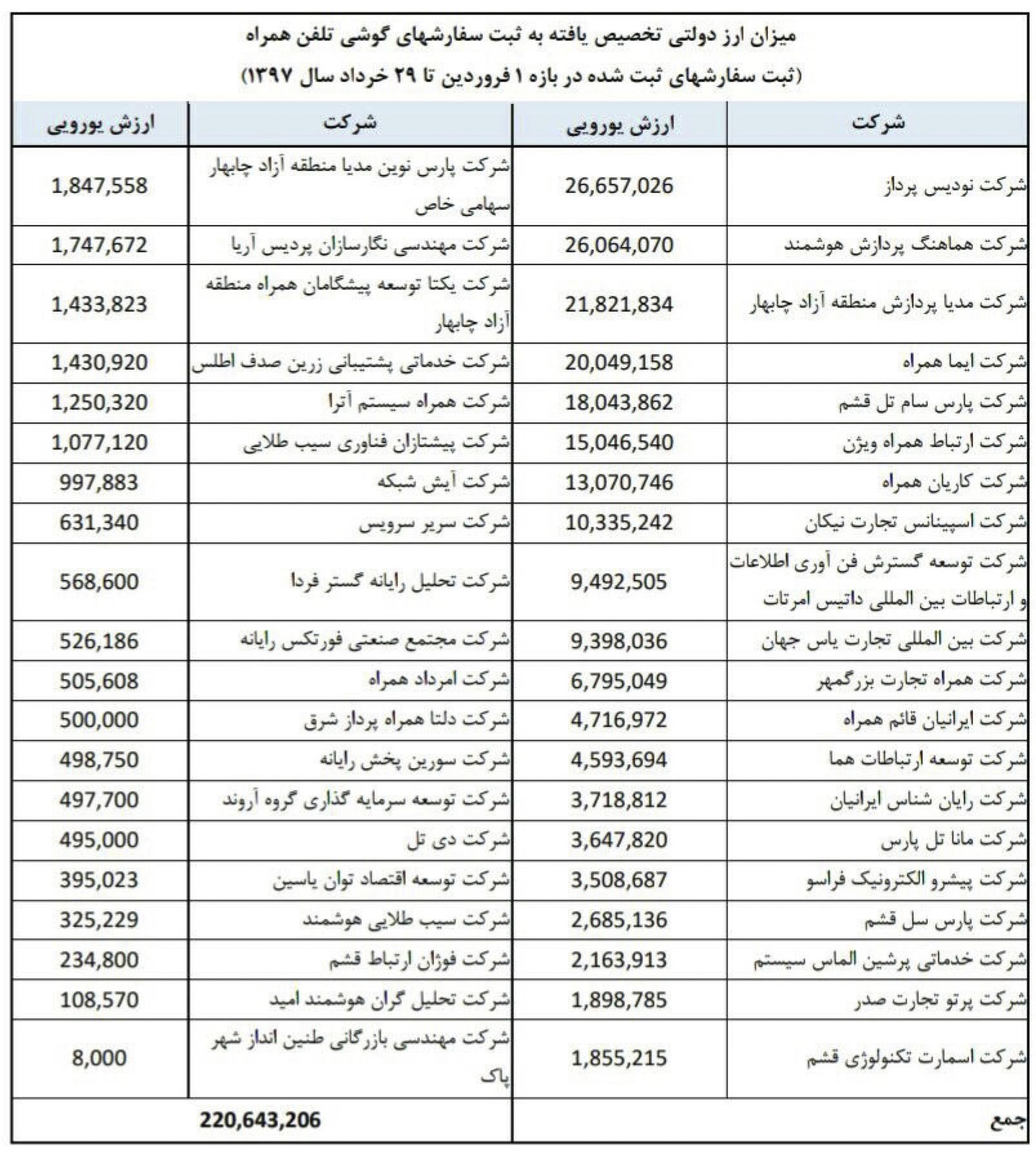 به گزارش خبرنگار اقتصادی خبرگزاری تسنیم، وزارت ارتباطات دو روز قبل لیست 40 شرکتی که از دلار 4200 تومانی برای واردات موبایل بهره مند شده بودند را منتشر کرد. بر اساس این لیست به 40 شرکت زیر مبلغی در حدود 220 میلیون یورو تخصیص داده شده در حالی که تا زمان انتشار گزارش مذکور، تنها 75 میلیون یورو موبایل توسط (تعدادی از) این شرکتها از گمرکات مختلف، کشور وارد شده است.
